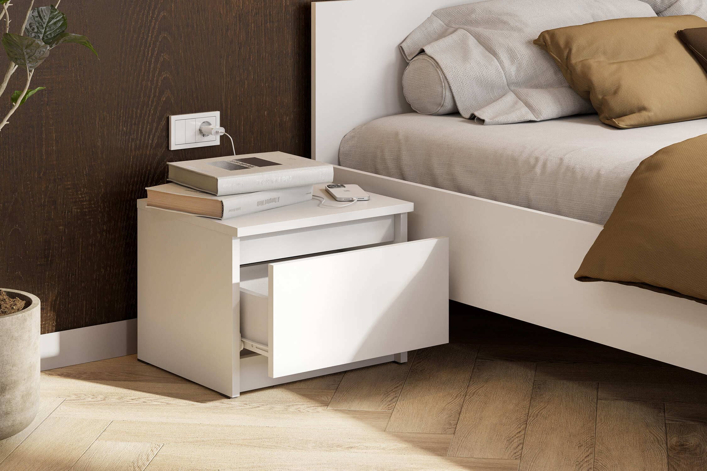 Комод c распашными створками и с тремя выкатными ящиками на роликовых направ- ляющих. Слева и справа отсеки для хранения с полкой. Фасады накладные.