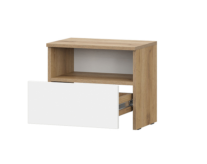 Тумба прикроватная с одим выдвижным ящиком на шариковых направлящих, над ящиком открытая ниша. Фасад накладной. Сборка корпуса не универсальная.