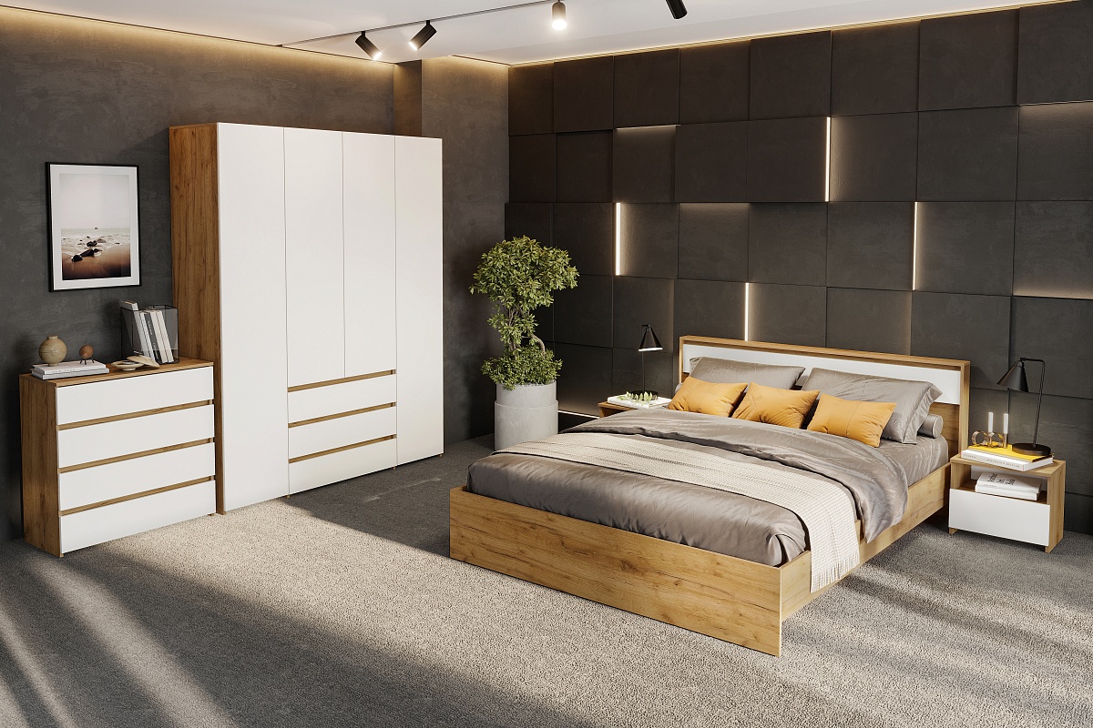 Шкаф четырехстворчатый c распашными створками и с тремя выкатными ящиками на шариковых направляющих. Над ящиками центральный отсек для хранения со штангой. За левой створкой расположены четыре полки. За правой створкой расположена штанга металлическая и полка. Створка открывается при помощи толкателя. Фасады накладные.