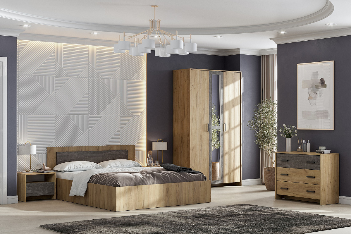 Каркасы кроватей полностью изготавливаются из ЛДСП в цвет корпуса, за исключением внутренних, невидимых деталей, изготавливаемых из неламинированного ДСП. В качестве декора на изголовьях кроватей устанавливаются накладки (ШхВ) 1134/1334х200 мм в цвет фасадов. Кровать по умолчанию не комплектуется основанием под матрац.