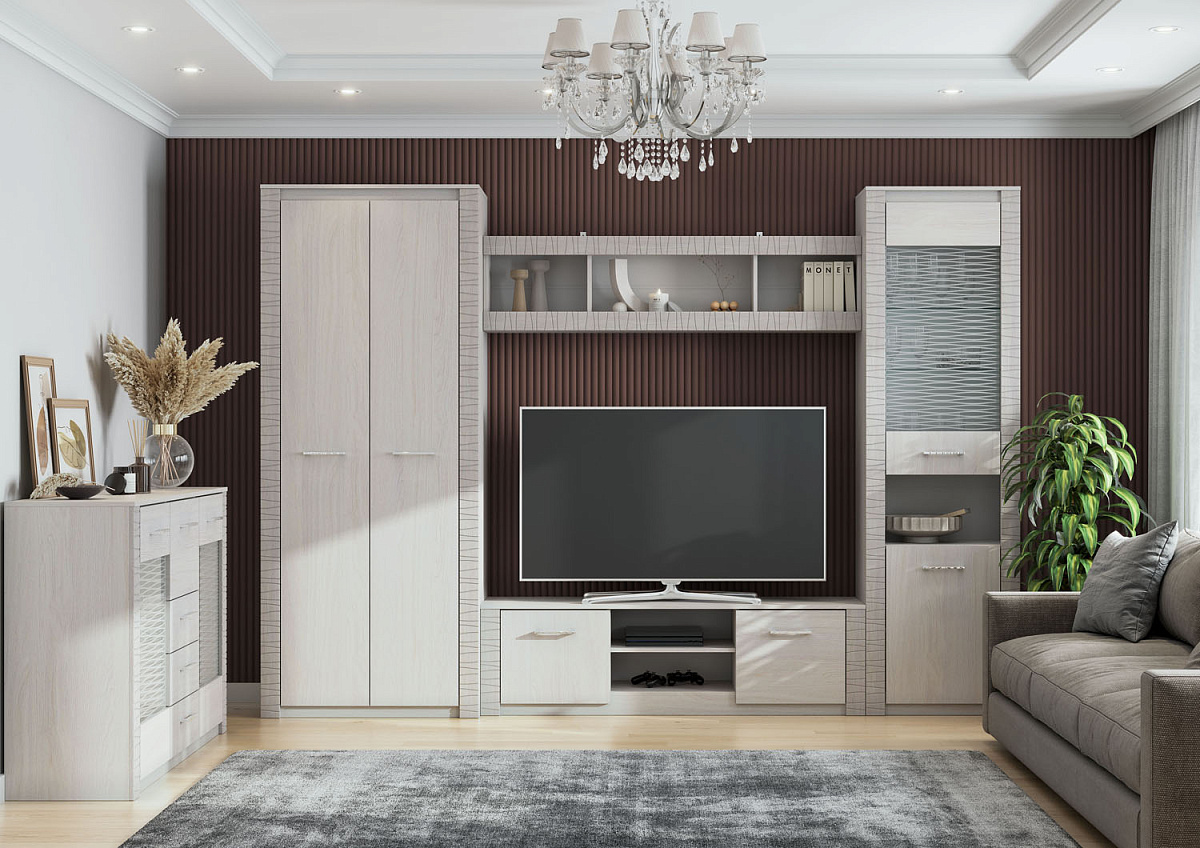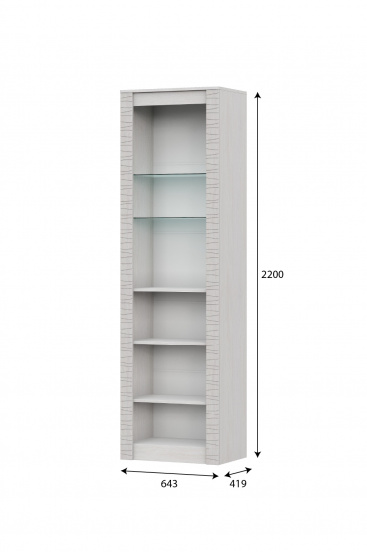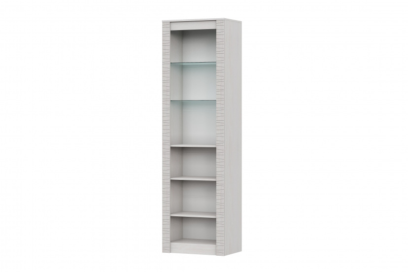 Модуль разделен вязками на два закрытых отделения и открытую нишу. Вверху отделение со стеклостворкой. В отделении устанавливается две полки из стекла 4 мм. Внизу располагается отделение с глухой створкой. Отделение комплектуется одной съемной полкой. Створки пенала могут навешиваться на любую боковину.