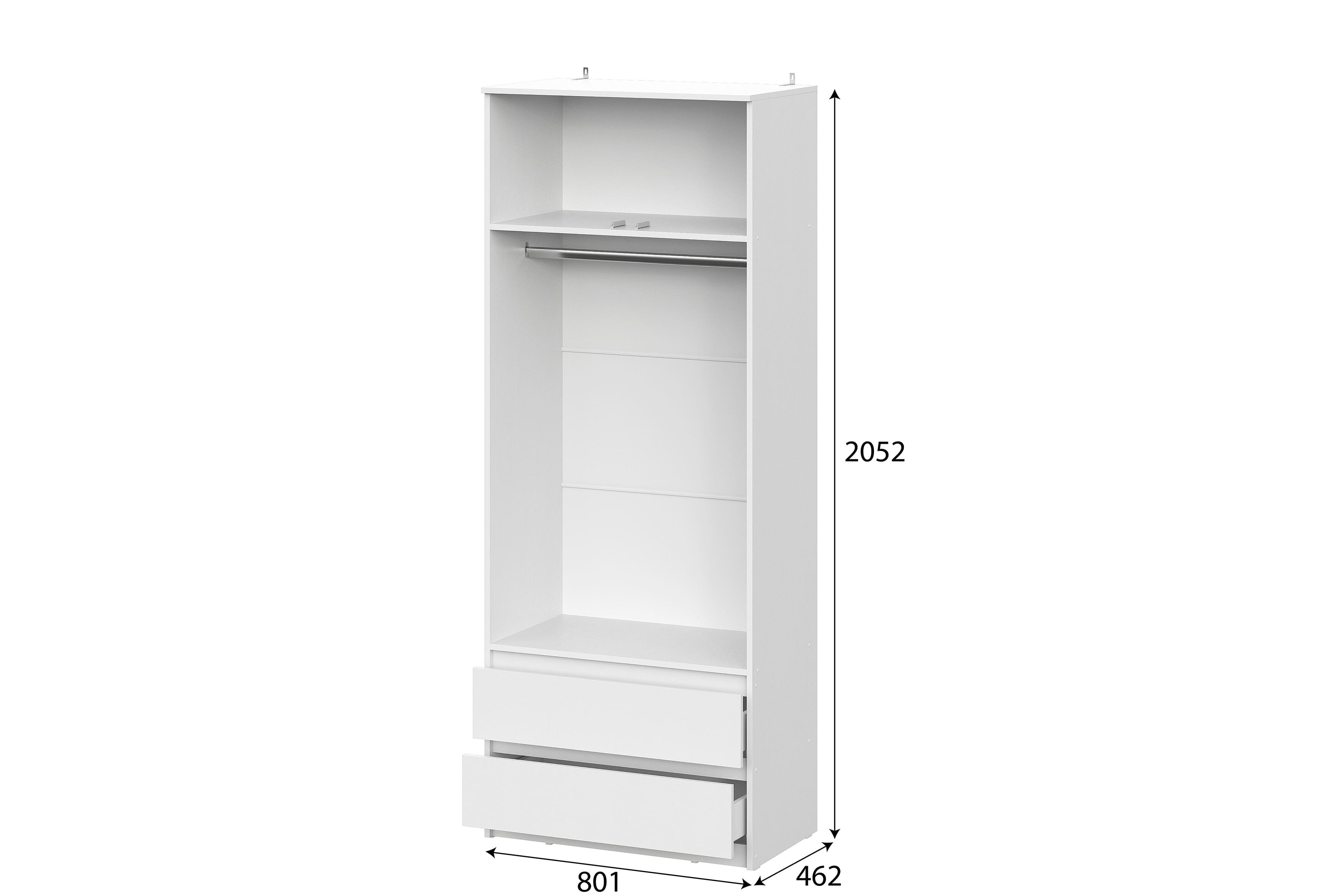 Комод c распашными створками и с тремя выкатными ящиками на роликовых направ- ляющих. Слева и справа отсеки для хранения с полкой. Фасады накладные.