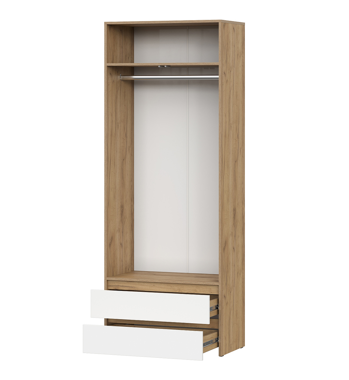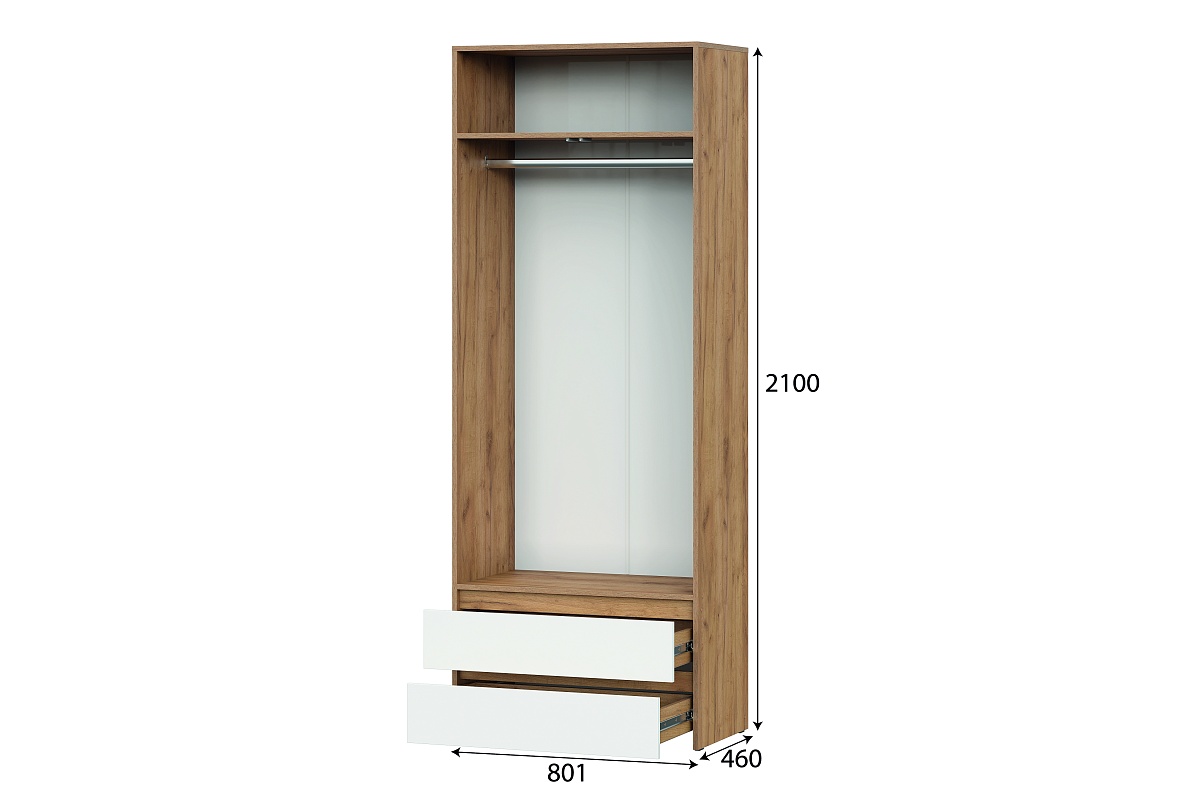 Шкаф двухстворчатый c распашными створками и с двумя выкатными ящиками на шариковых направляющих. Над ящиками отсек для хранения со штангой и полкой сверху. Фасады накладные.