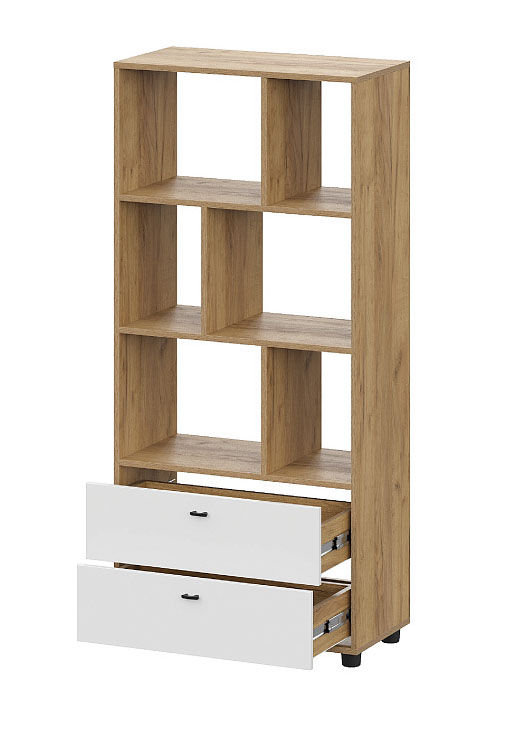 - Конструкция и функциональность: Стеллаж совмещает открытые ниши для книг и декора и два вместительных выдвижных ящика. Сборка корпуса не универсальная, стеллаж поставляется без задней стенки.