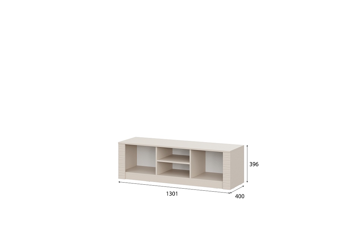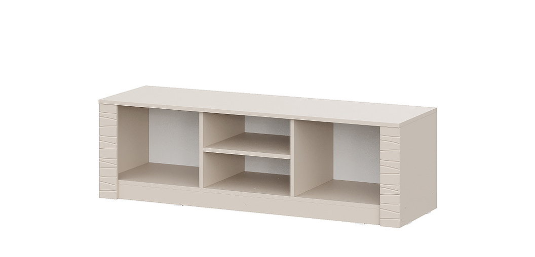Комод c распашными створками, декоративными элементами из МДФ в ПВХ пленке с фрезеровкой от МС Гамма-20 и с тремя выкатными ящиками на роликовых направляющих. Слева и справа отсеки для хранения с полкой. Крайние створки крепятся на декоративные планки из МДФ. Фасады накладные.