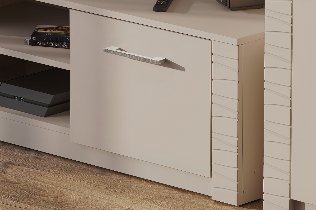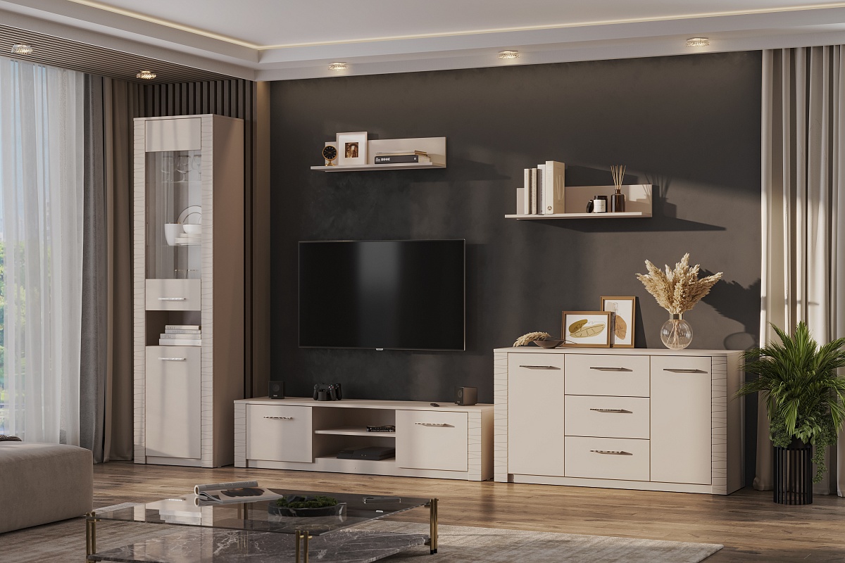 Комод c распашными створками, декоративными элементами из МДФ в ПВХ пленке с фрезеровкой от МС Гамма-20 и с тремя выкатными ящиками на роликовых направляющих. Слева и справа отсеки для хранения с полкой. Крайние створки крепятся на декоративные планки из МДФ. Фасады накладные.