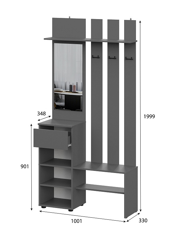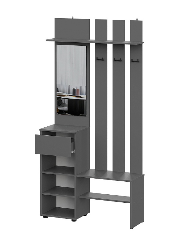 Сборка корпуса универсальная (собирается как на левую, так и на правую сторону). Обязательно крепление зеркала и вешалки к стене при помощи входящих в комплект плоских навесов. Максимальная нагрузка на ящики - 5 кг, на крышку тумбы - 20 кг, на верхнюю полку под вешалкой - 10 кг, на нижнюю полку под вешалкой - 5 кг, на полку вешалки - 3 кг.