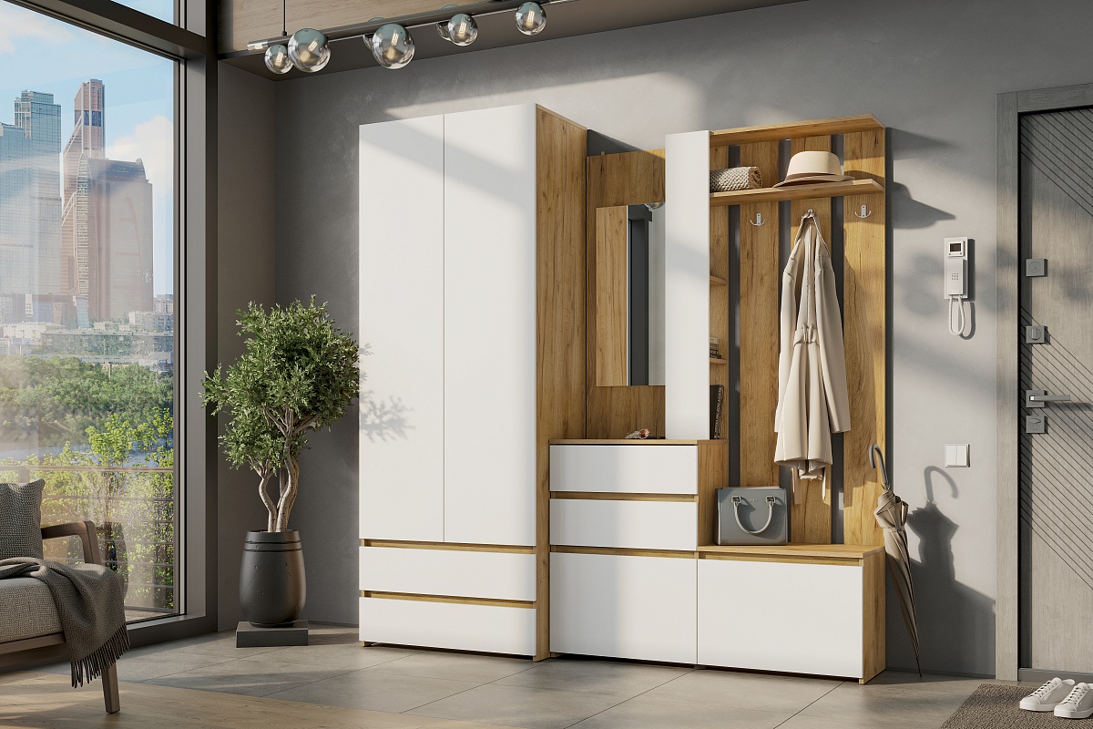 Модуль для прихожей представляет собой вешалку из трех планок ЛДСП с установленными на них 2х рожковыми крючками с полками для головных уборов, тумбу-обувницу с закрытыми отсекоми для хранения с распашной створкой и ящикоми для мелочей на шариковых направляющих. На тумбе установлено зеркало, под вешалкой есть место хранения стеллажного типа .Фасады накладные.